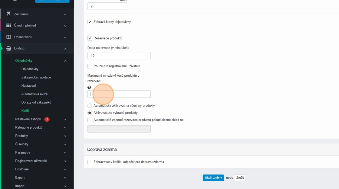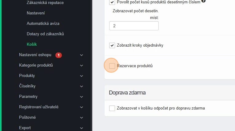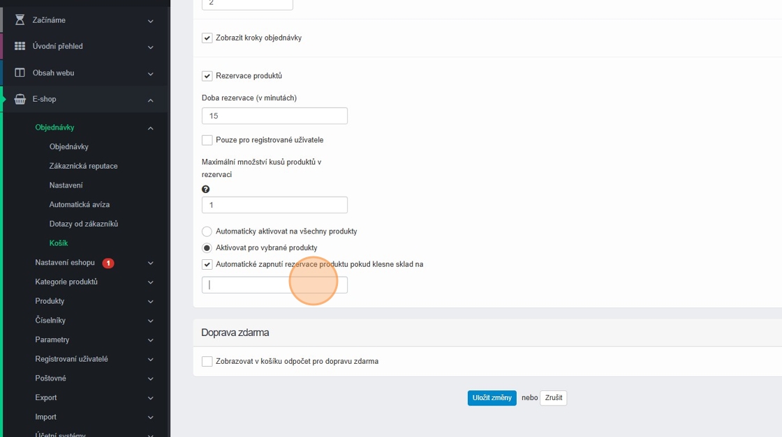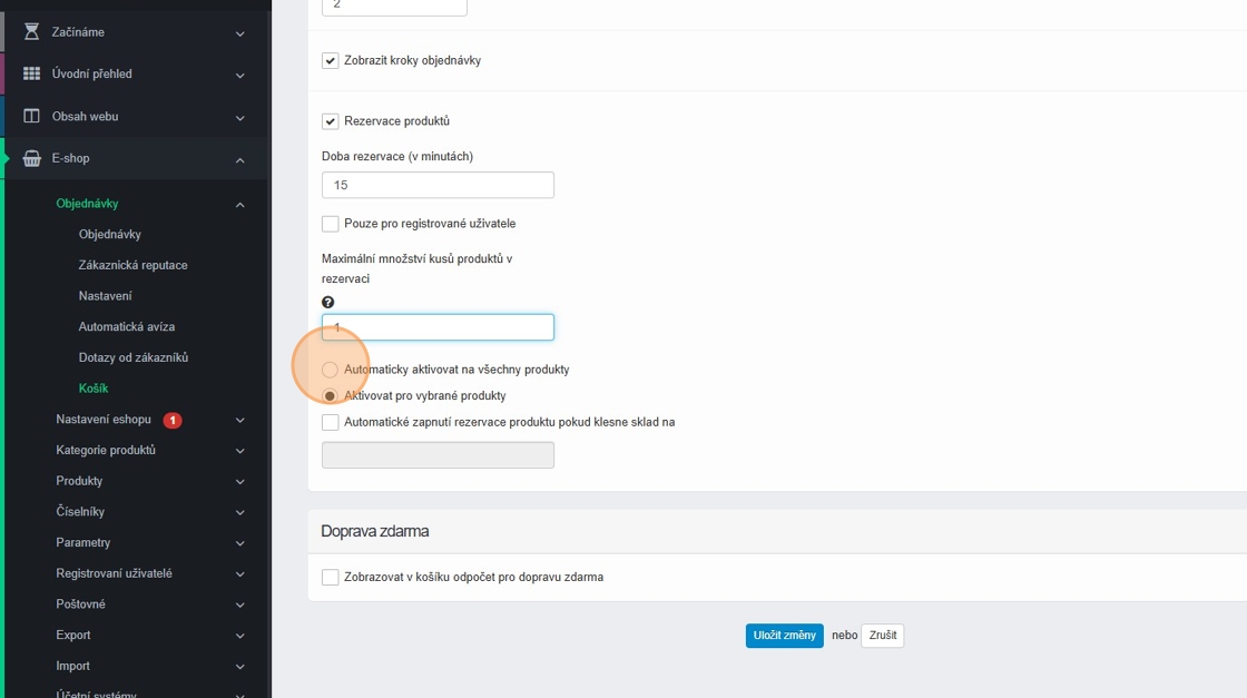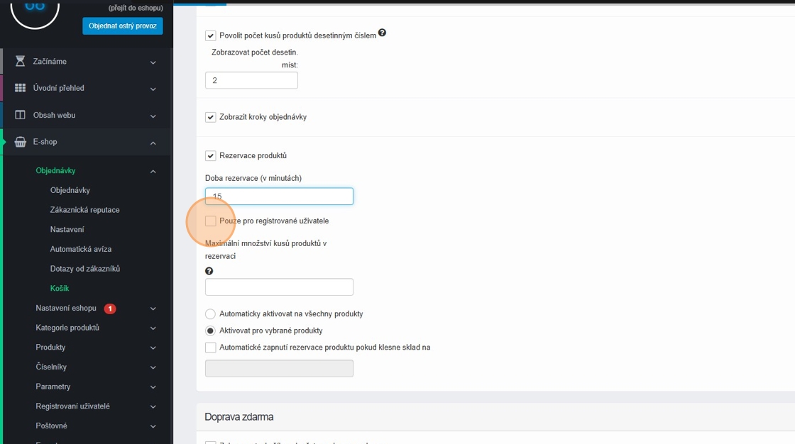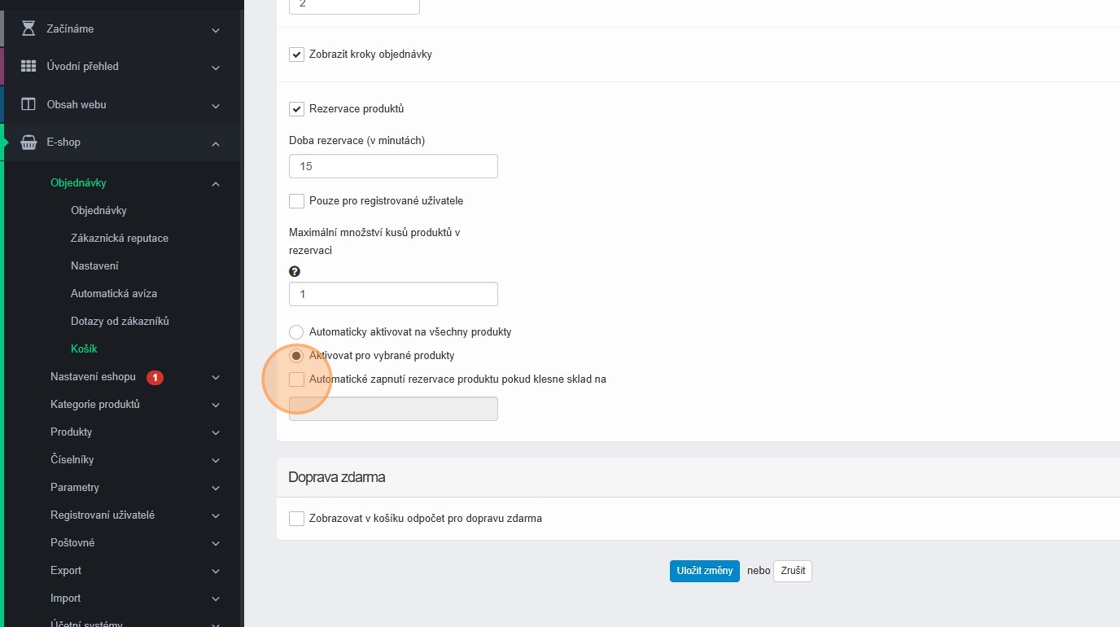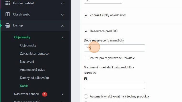 3. Po nastavení správné varianty skladu již můžete funkci aktivovat v sekci E-shop – Objednávky – Košík a následně „Rezervace produktů„.