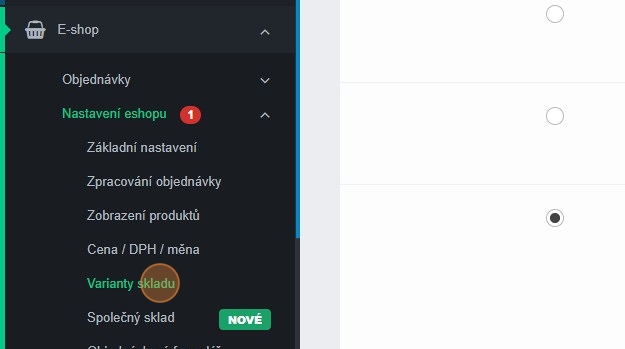 1. Variantu skladu si změníte v sekci E-shop – Nastavení eshopu – Varianty skladu.
