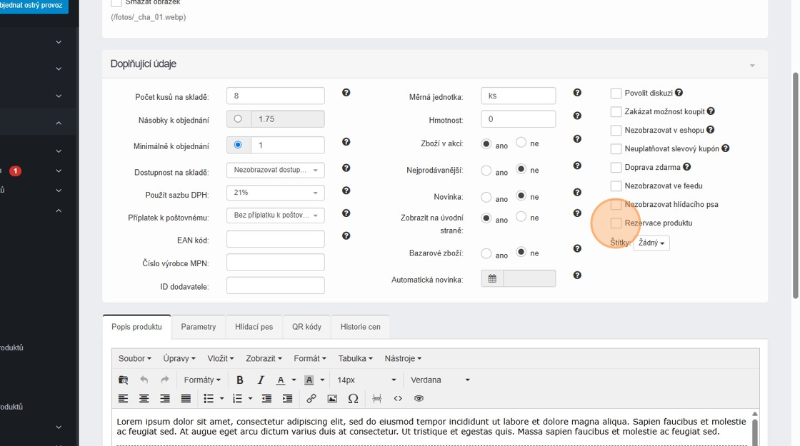 12. V úpravě produktu pak pouze zatrhněte „Rezervace produktu“ a uložte.