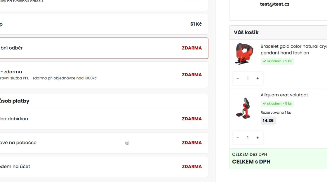 13. Zde vidíte zobrazení produktů v košíku s i bez rezervace. U rezervovaného produktu si můžete všimnout odpočtu a počtu rezervovaných kusů.