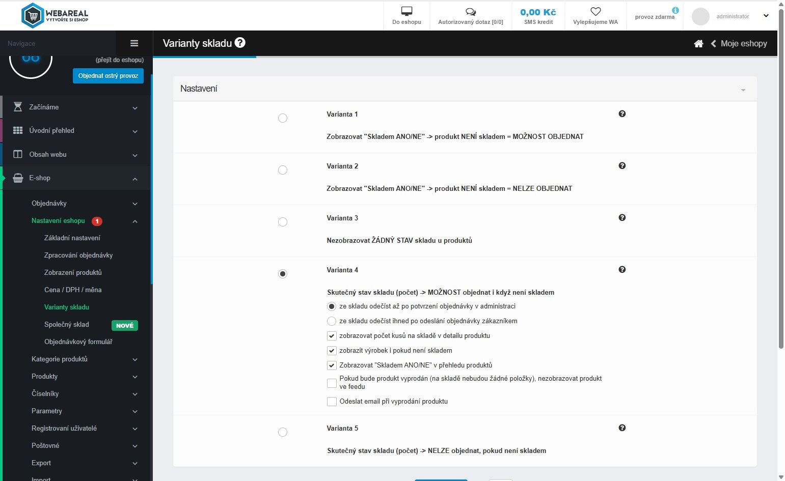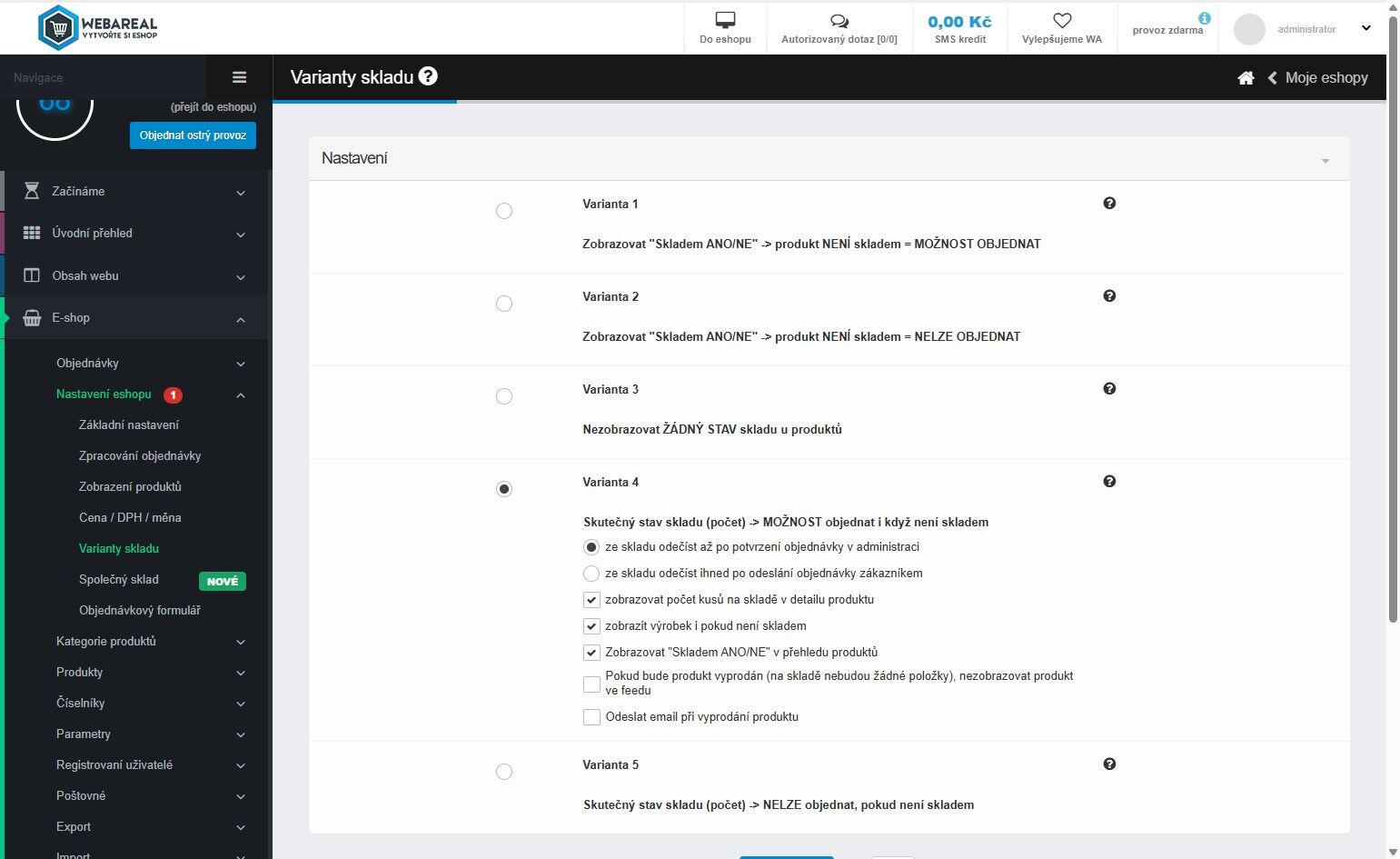 1. Variantu skladu si změníte v sekci E-shop – Nastavení eshopu – Varianty skladu.