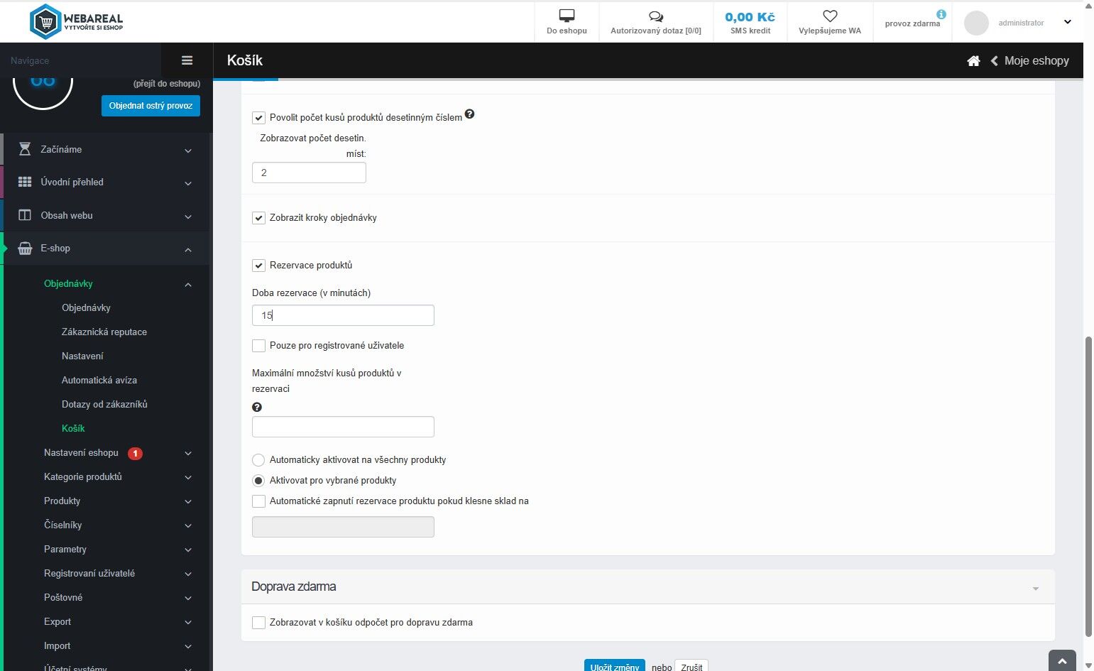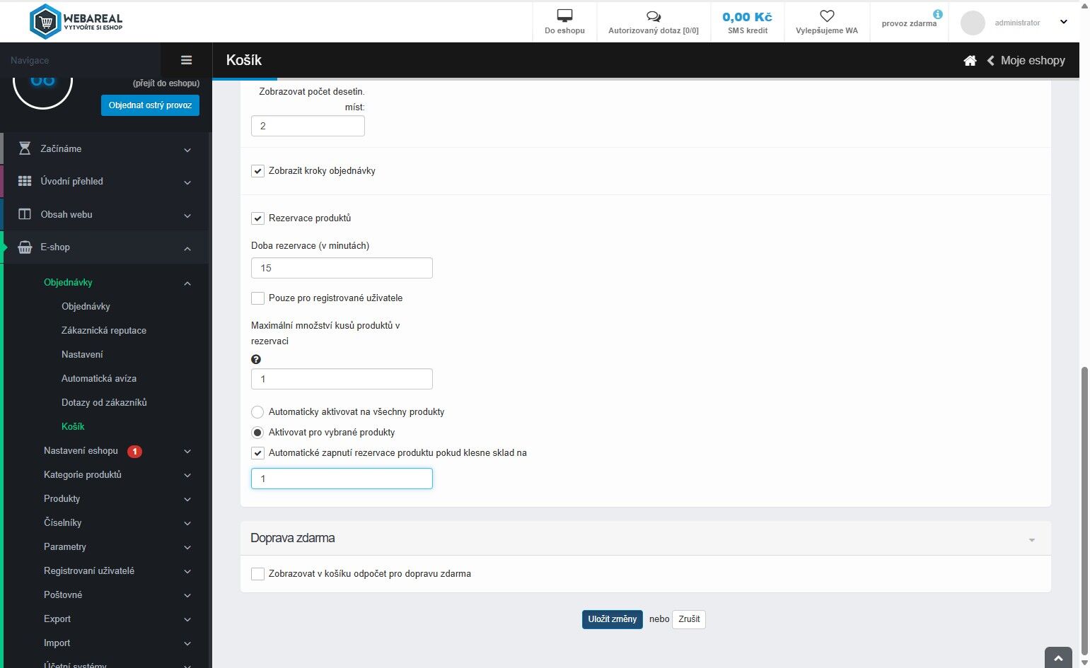 3. Po nastavení správné varianty skladu již můžete funkci aktivovat v sekci E-shop – Objednávky – Košík a následně „Rezervace produktů„.