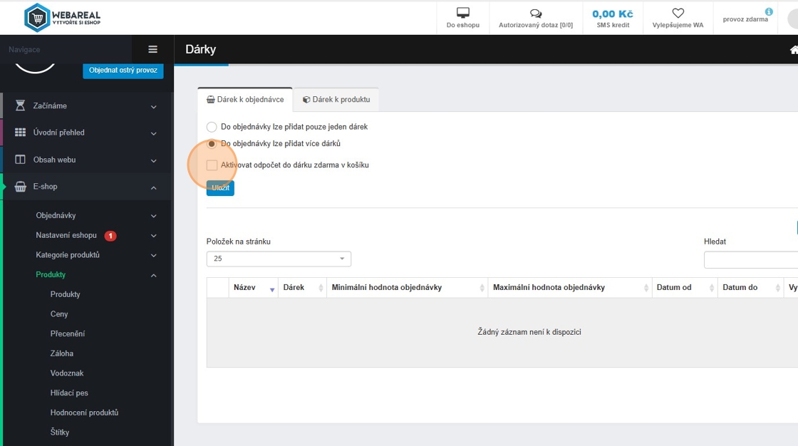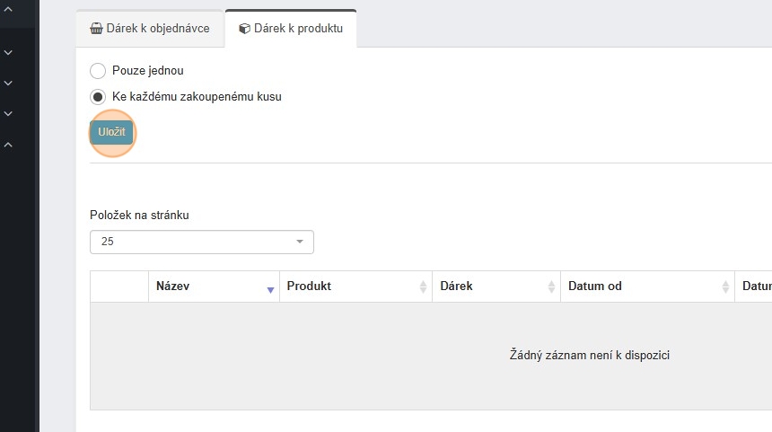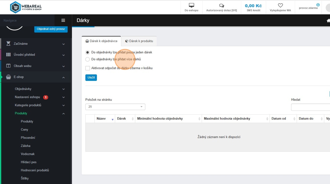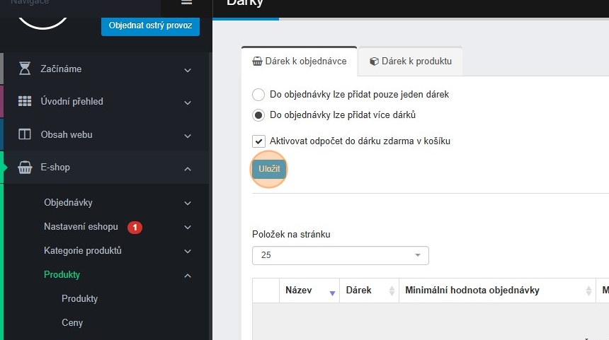 9. Začneme nastavením dárků k objednávce. Zde si můžeme zvolit „Do objednávky lze přidat pouze jeden dárek“. To znamená, že pokud zákazník dosáhne na více dárků, může si zvolit pouze jeden z nich.