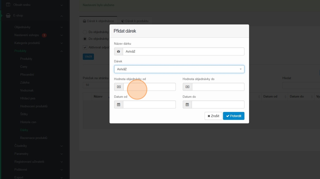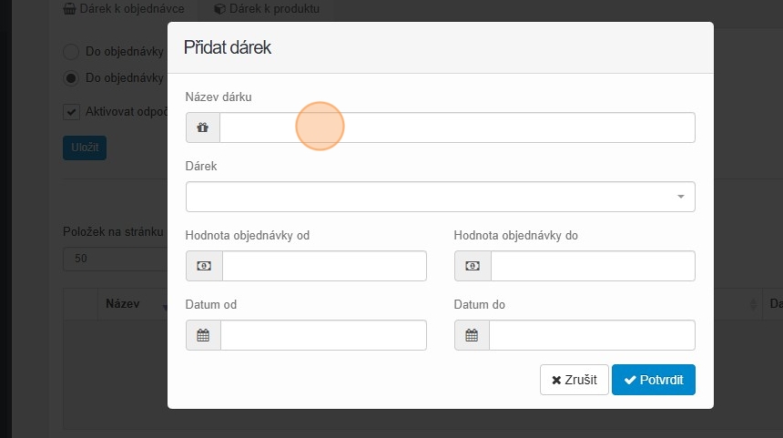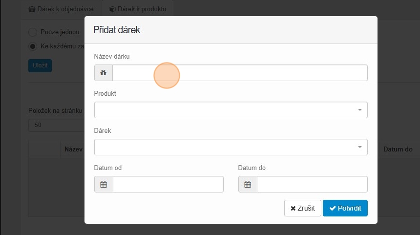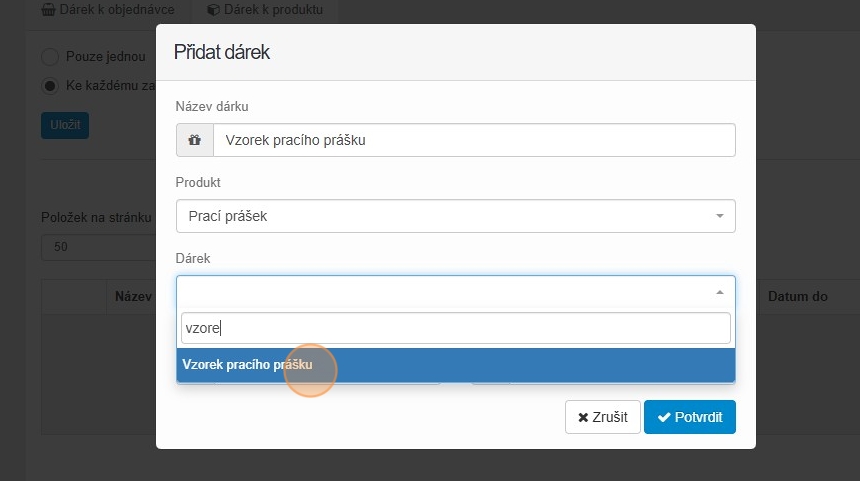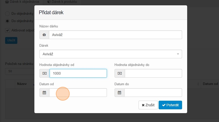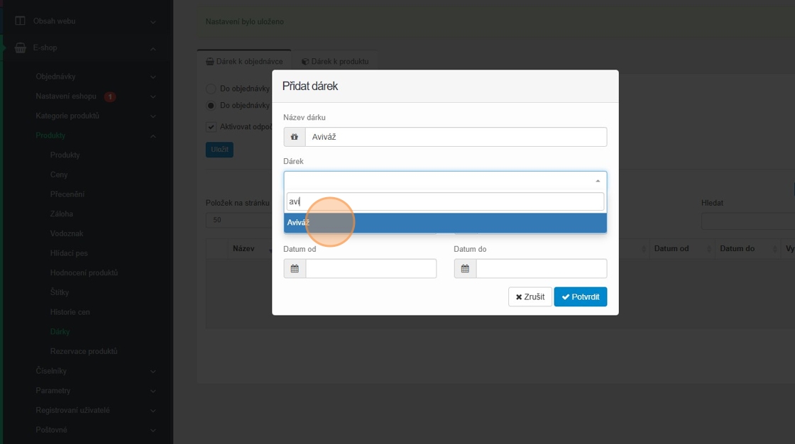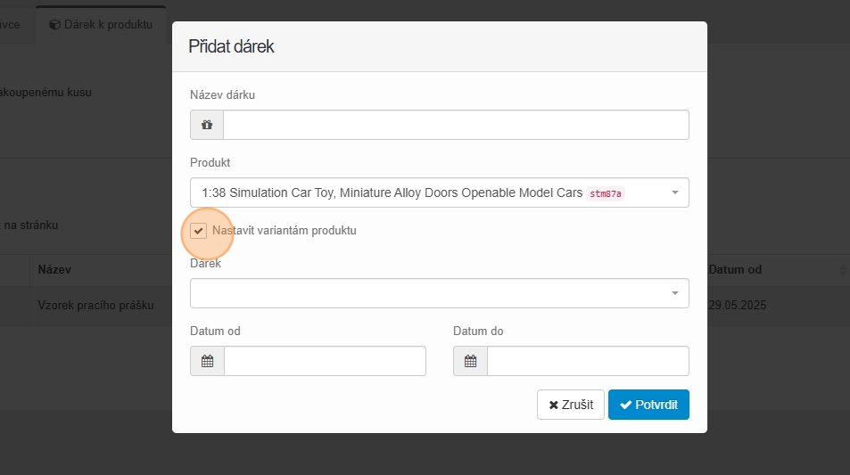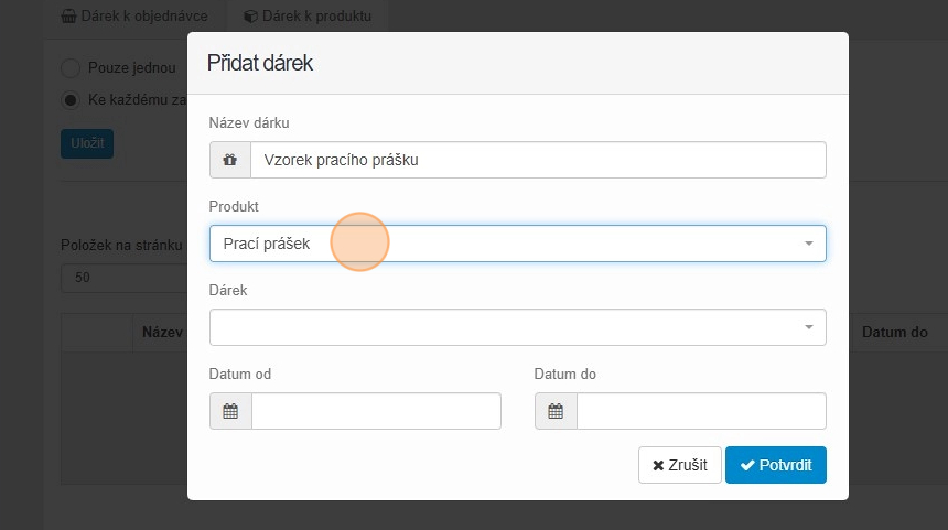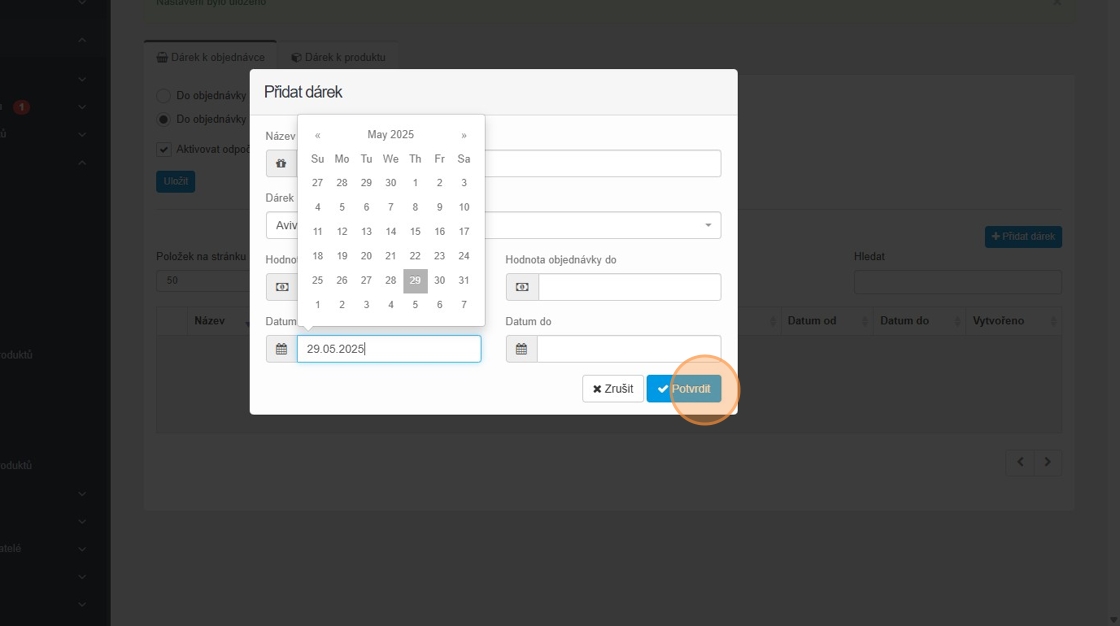 27. Vyplňte datum od kdy do kdy se má dárek k produktu rozdávat a klikněte na tlačítko „Potvrdit“.