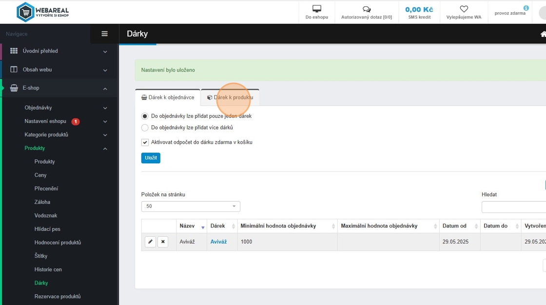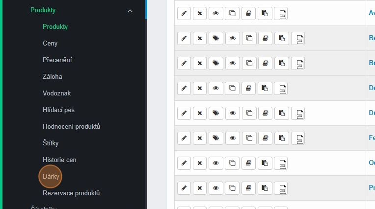 8. Po založení potřebných dárků přejdeme do sekce E-shop – Produkty – Dárky.