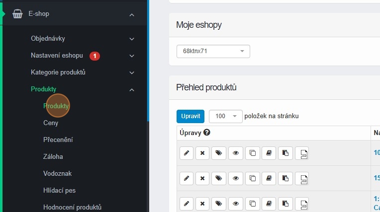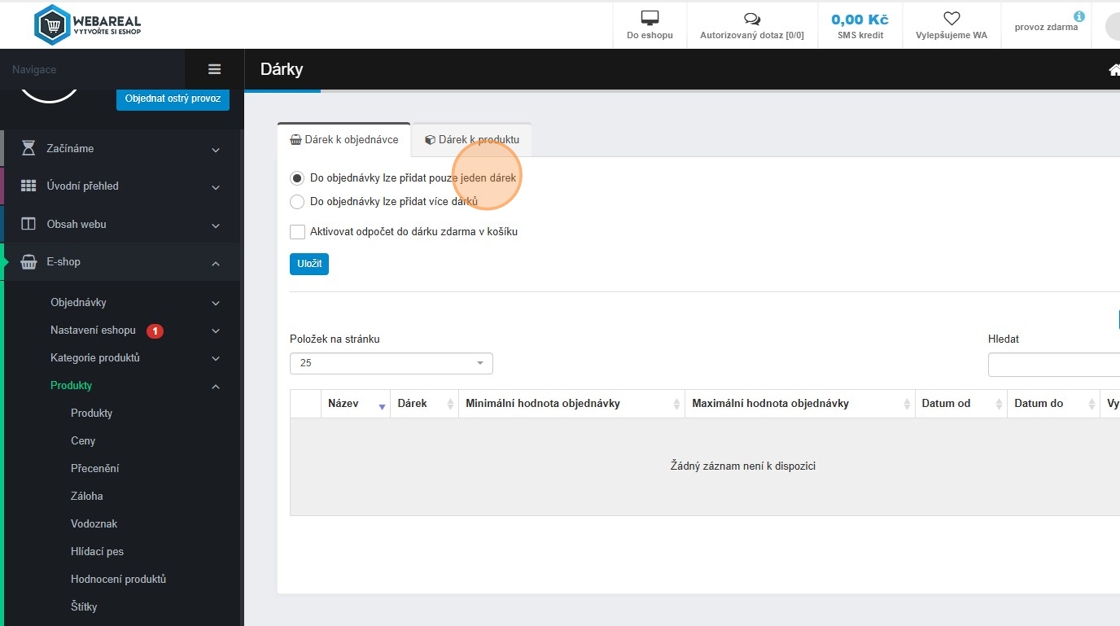1. Přípravu dárku provedeme v sekci E-shop – Produkty – Produkty.