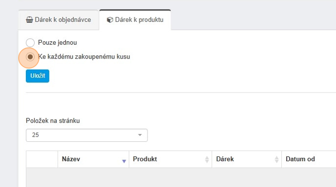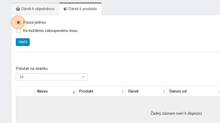 20. Opět zde máme na výběr jak se bude dárek k produktu chovat. Při zvolení „Pouze jednou“ se dárek do košíku přidá pouze jednou bez ohledu na to, kolik kusů produktu, který má dárek k dispozici zakoupíme.
