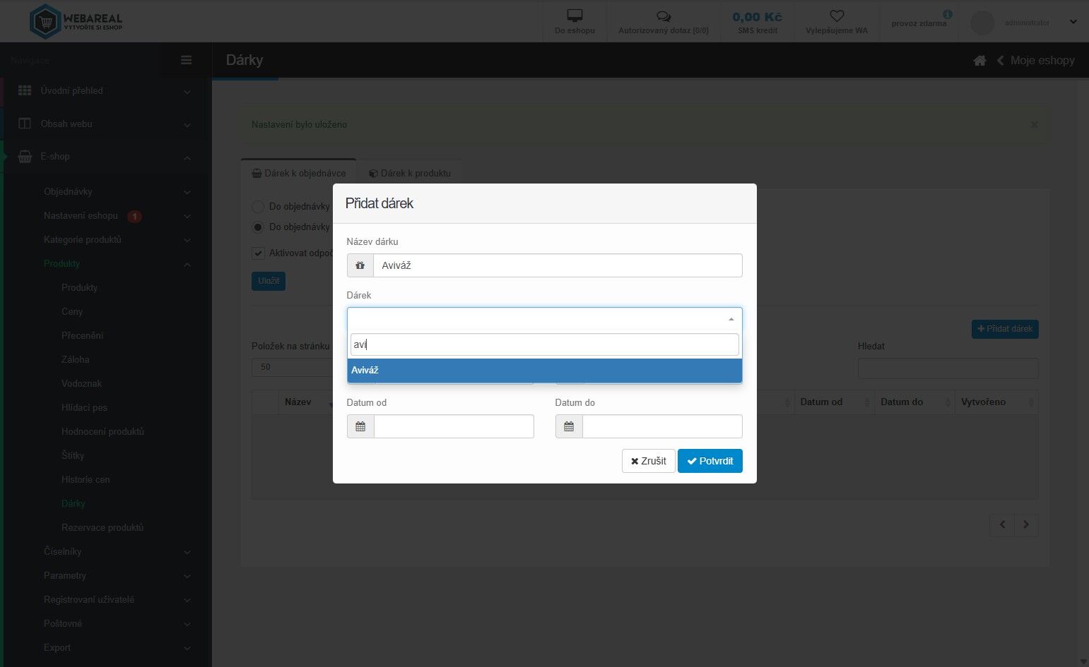 27. Vyplňte datum od kdy do kdy se má dárek k produktu rozdávat a klikněte na tlačítko „Potvrdit“.