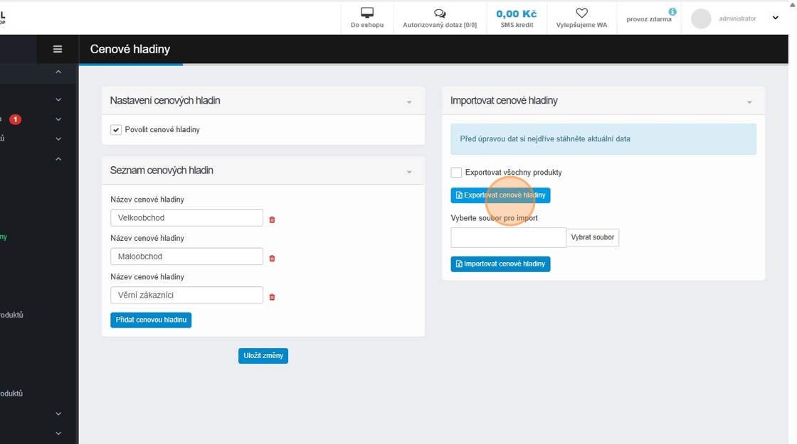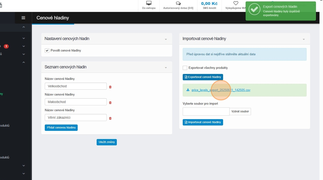 Hromadný export a import cenových hladin pomocí CSV souboru.