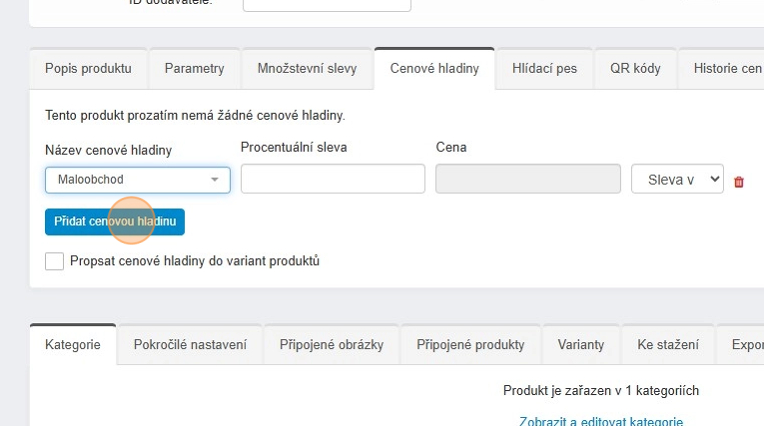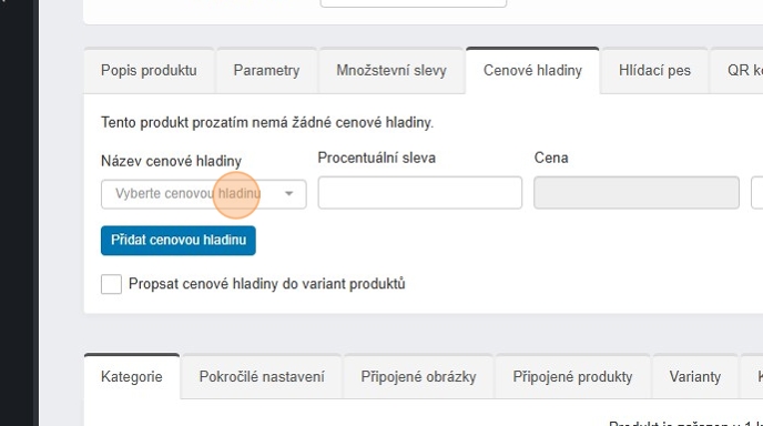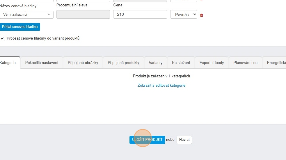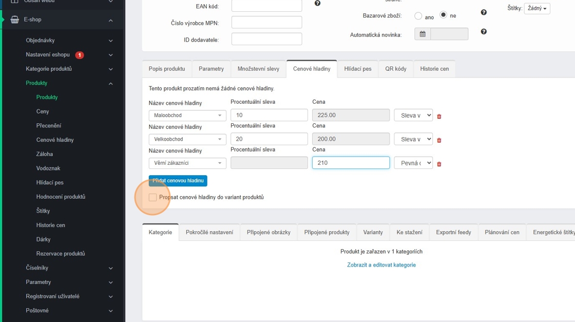 14. Cenové hladiny můžete ihned propsat i do variant pomocí checkboxu „Propsat cenové hladiny do variant produktů“.