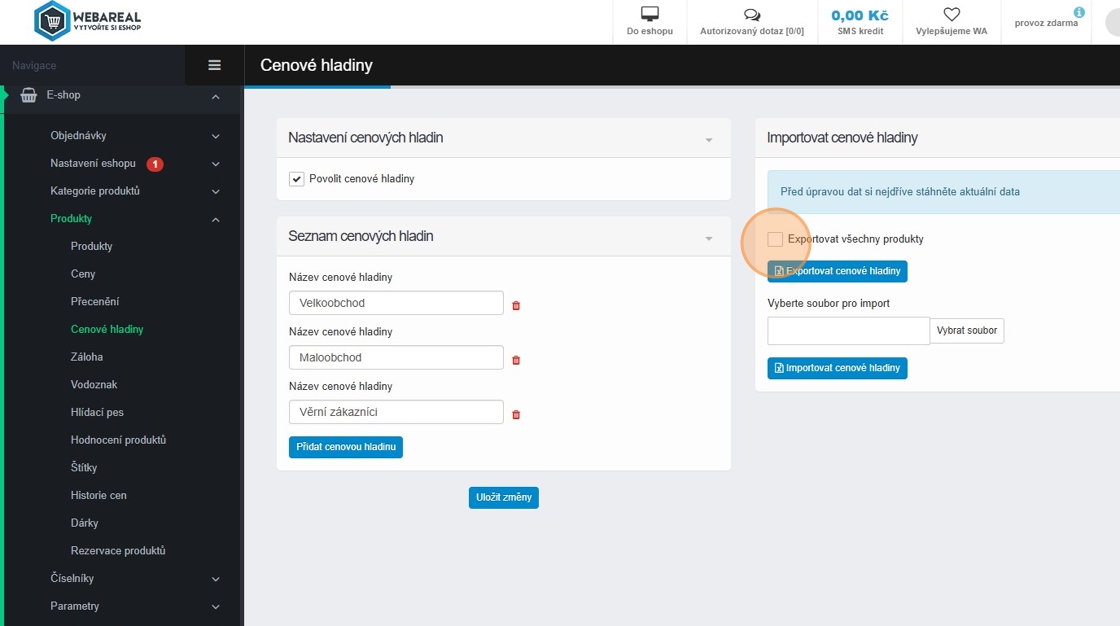 34. Export a import cenových hladin provedete v sekci E-shop – Produkty – Cenové hladiny. Zde naleznete checkbox „Exportovat všechny produkty“.