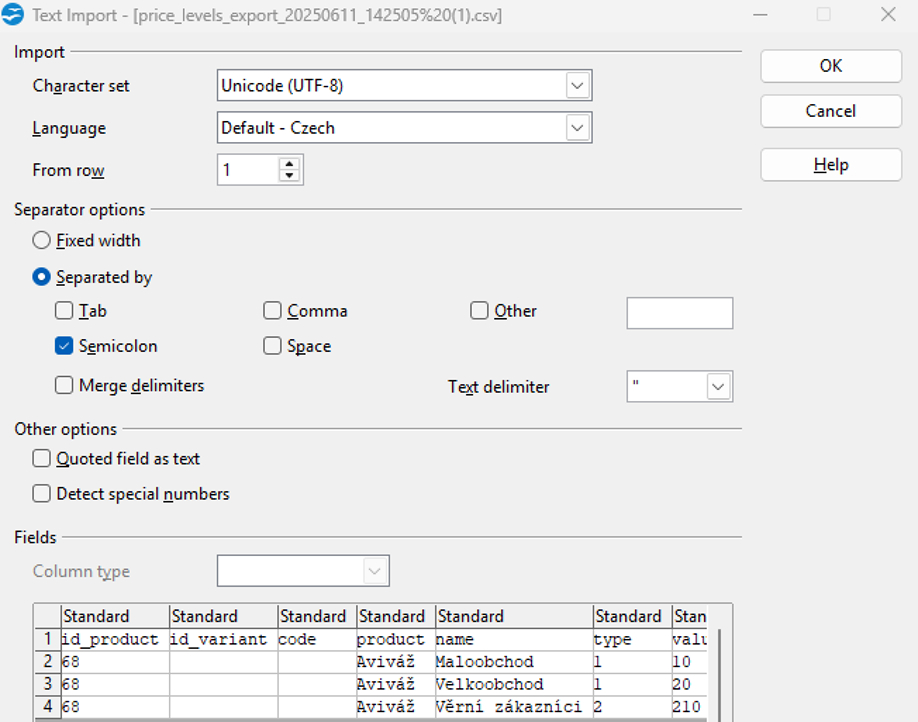 37. Zvolte kódování UTF-8 a jako oddělovač nastavte středník.