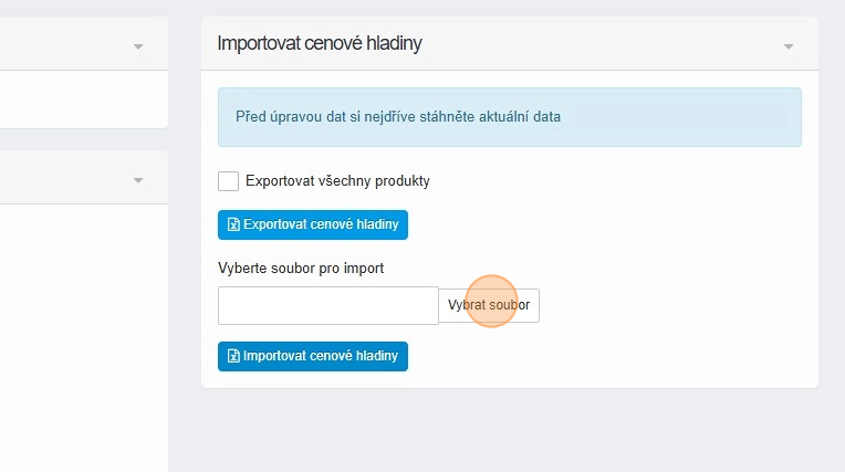38. Jakmile máte soubor upraven, můžete jej nahrát zpět pomocí tlačítka „Vybrat soubor“ a následně „Importovat cenové hladiny“.