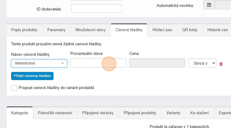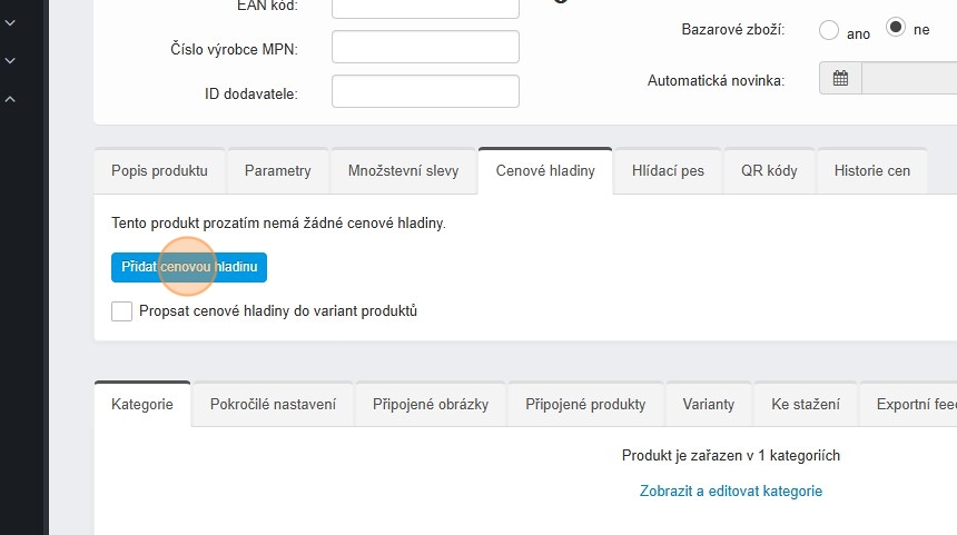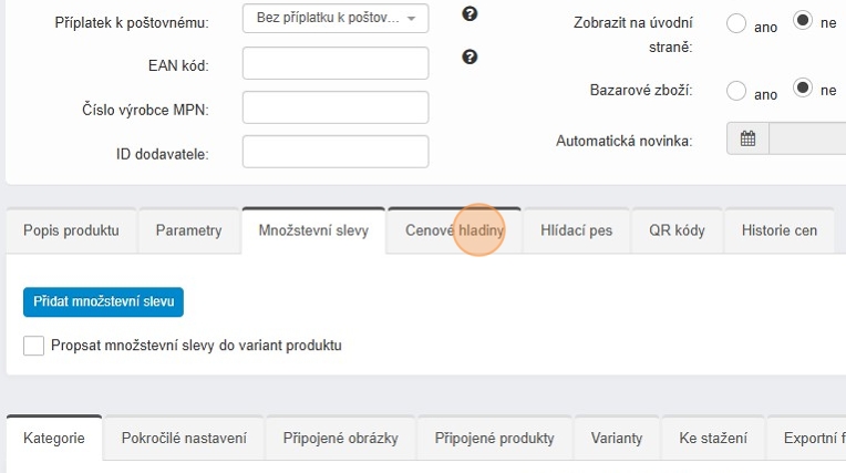 Pokud chcete zadávat ceny zadávat pevnou částkou, vyplňte cenové hladiny přímo v úpravě produktu nebo pro hromadnou změnu využijte CSV soubor viz návod níže.