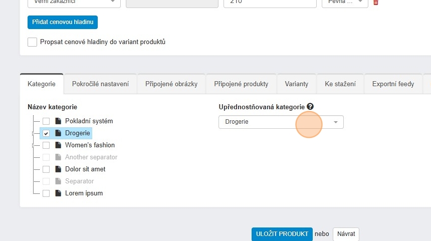 16. Pokud je produkt umístěn ve více kategoriích bere se jako prioritní kategorie „Upřednostňovaná kategorie“.
