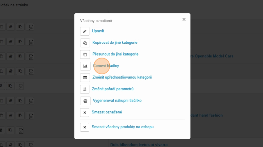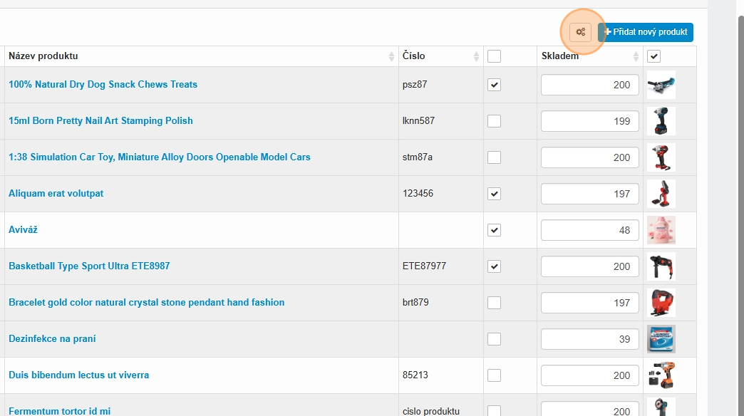 18. V sekci E-shop – Produkty – Produkty si označte produkty, kterým chcete hromadně hladiny nastavit a následně klikněte na ikonu ozubených koleček.