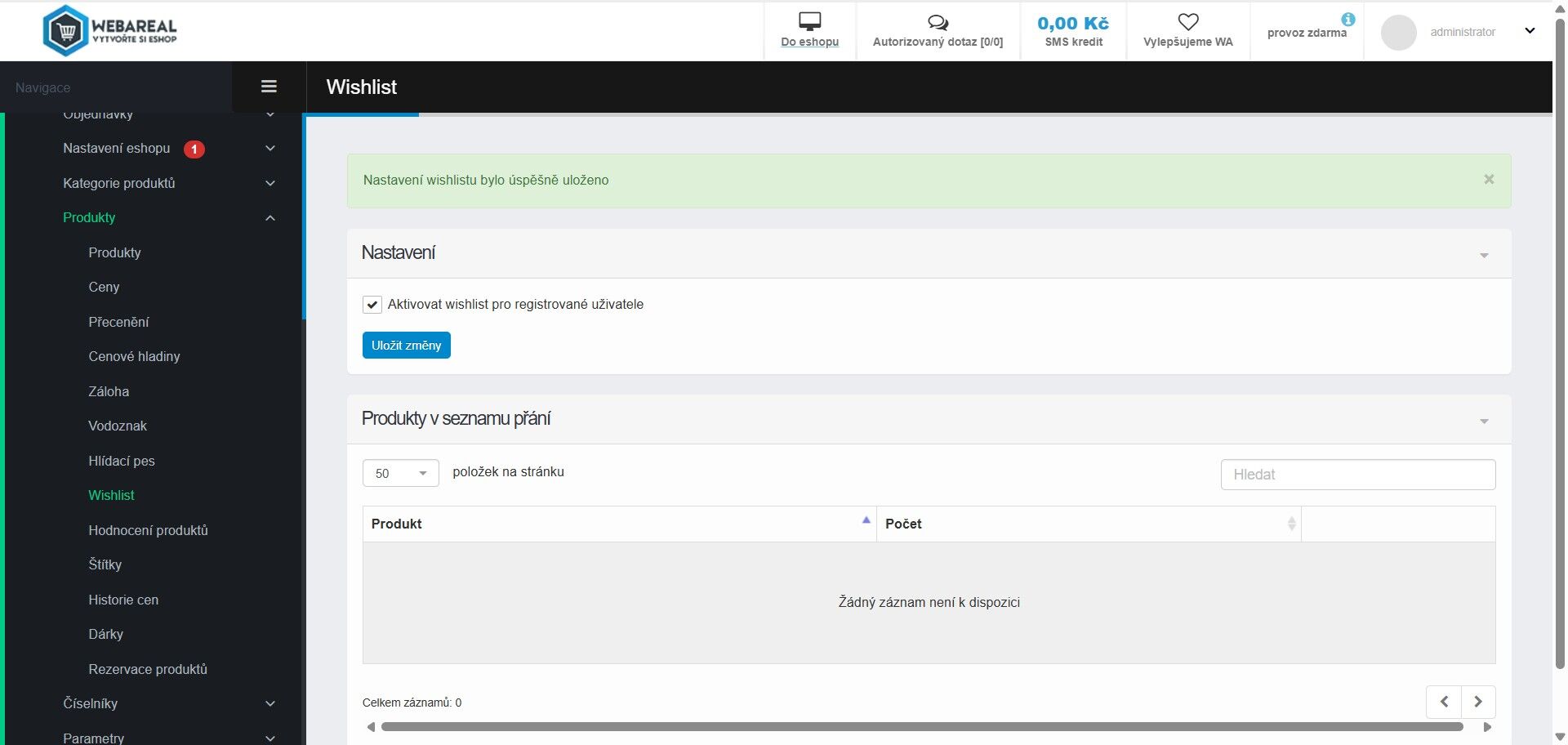1. Wishlist aktivujete v sekci E-shop – Produkty – Wishlist.